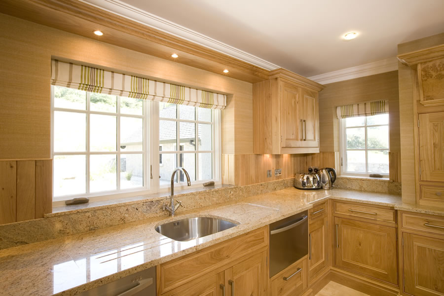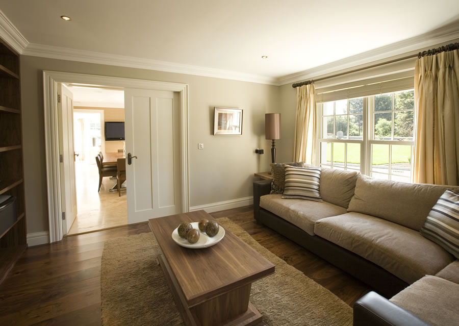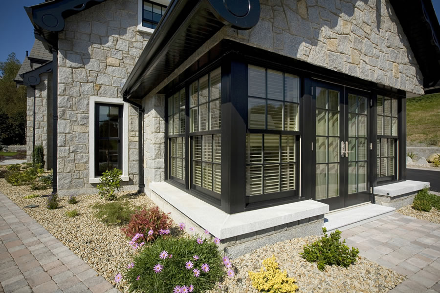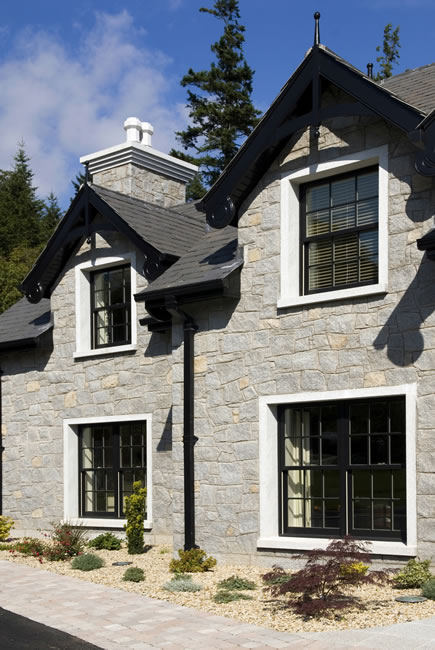The project architect had not only designed 2 dimensional plans for this home but utilised 3 dimensional graphic imagery to create the finished visual impression required for this building. This included traditional Georgian style, black, sliding sash windows and doors to the house and sunroom. Marvin's Ebony aluminium clad windows were the ideal choice, being finely machined to imitate a painted wood finish, while eliminating time-consuming and costly exterior painting. The colour was ideal against the backdrop of the grey stone and granite surrounds. The natural wood interior was painted white to blend with the interior décor and joinery.
